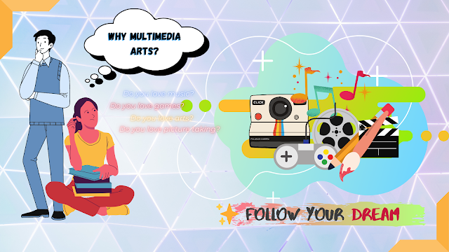 In this illustrations I named it, Why Multimedia arts and it explains what can you do and what can you work with in Multimedia arts. I used the principles Redundancy Principle, Segmentation Principle and Coherence Principle, I used the redundancy principle wherein as you can see in the illustration I only use a few text and use more visual images like clip arts because based on some studies images are more easy to remember and process in the brain rather than text, in the left side and it explains what can you do and what can you work with when you enter multimedia arts. I also used the segmentation principle where in I grouped the elements into 2 in the left side which are the text and in the right side which are the images so that it will look neat and organized as the viewers see it.Lastly I used the Coherence Principle where in I only used few elements so that the whole illustration will not look like cramped and the audience will clearly understand what the illustration means. Lastly the word FOLLOW YOUR DREAM is the most important and it serves as a motivation for aspiring artists.